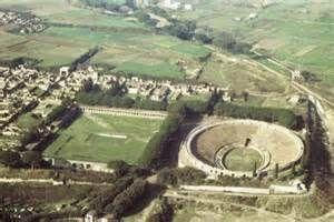 The Palaestra was an open-air wrestling training and competition complex (circular arena), including full training grounds (rectangle). The training yard was surrounded by columns on all sides which would have included bathrooms, medical and storage facilities for training equipment.